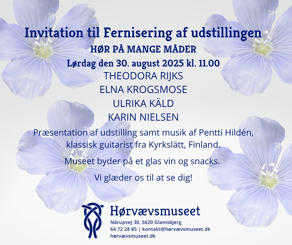 Vi indbyder alle interesserede til fernisering af udstillingen “hør på mange måder” af Theodora Rijks, Elna Krogsmose, Ulrika Käld og Karin Nielsen. Til ferniseringen spiller Pentti Hildén, klassisk guitarist fra Kyrkslätt, Finland.