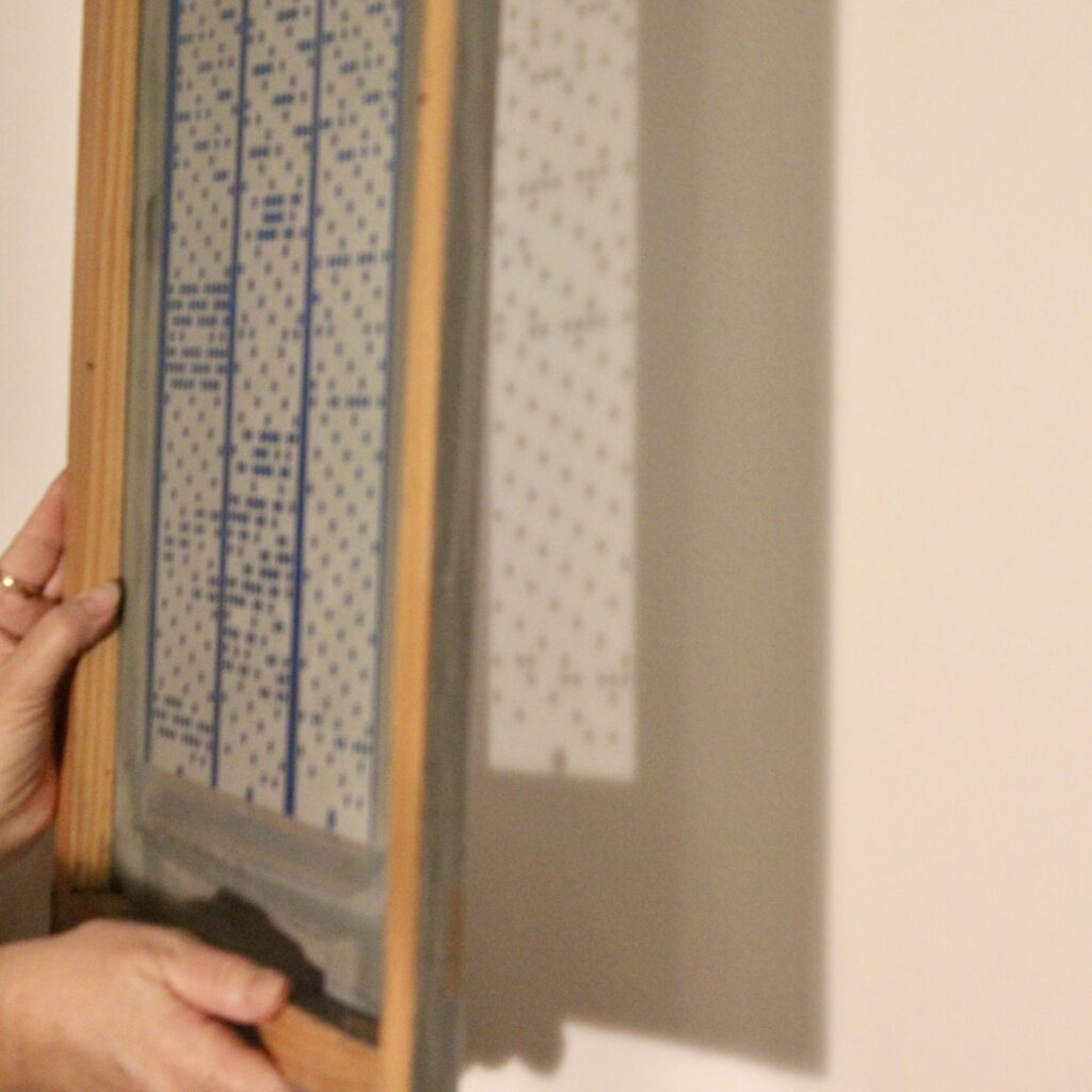 De lange stofbaner trykt på hør hænger på væggene rundt i caféen. I glasmontrene, er det tanken at udstille dele fra processen, samt rumlige tekstiler med samme tryk.