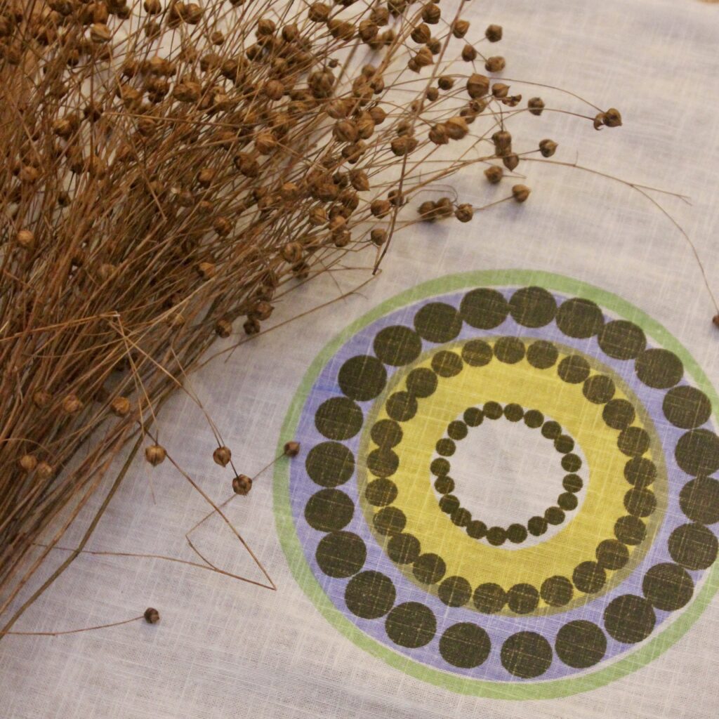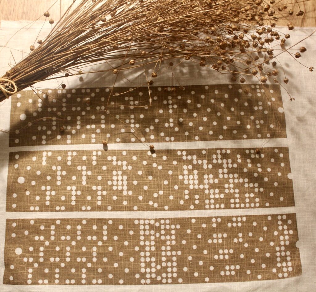 Med tryk på hør i lange baner vises vejen fra hørfrøet til planten med de smukke blå blomster og et kik ind i de lange hørfibre, inden den forarbejdede hør kan anvendes til nye tekstiler på Jacquardvæven eksemplificeret med tryk af hulkort.